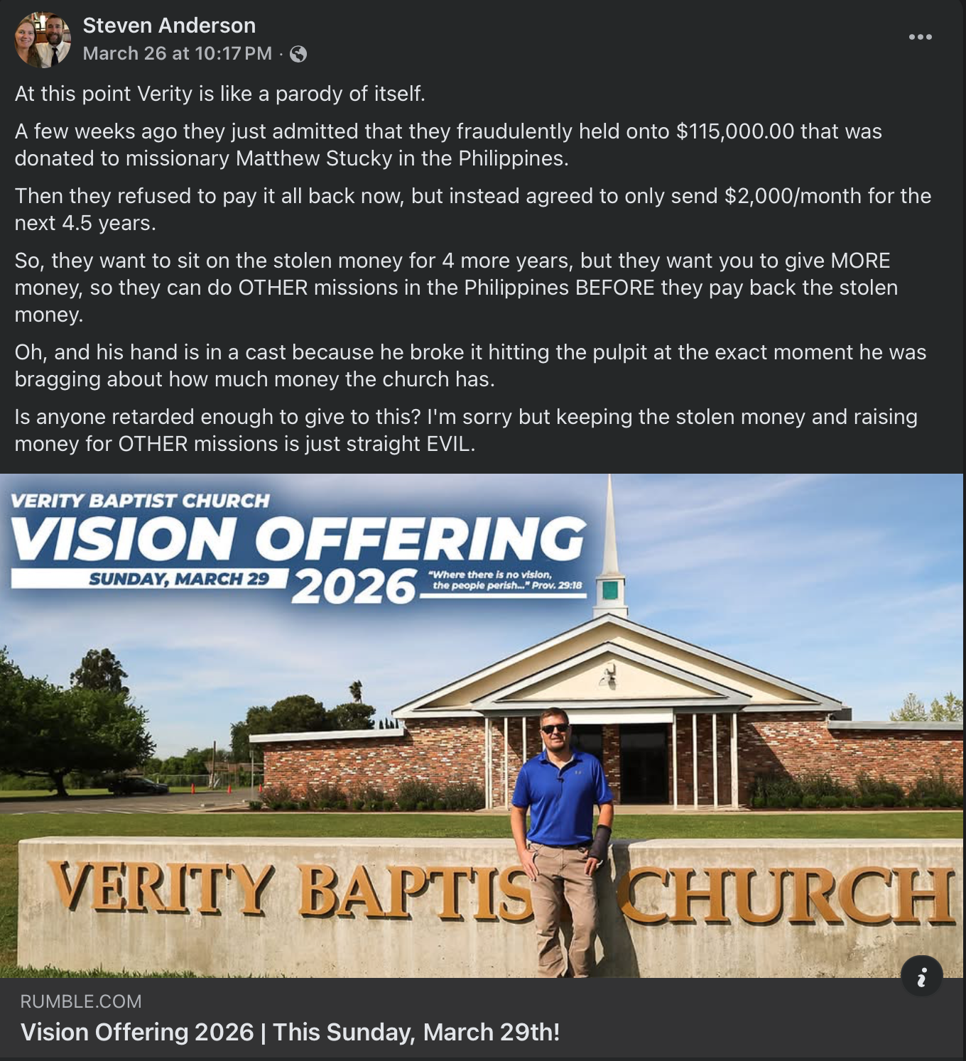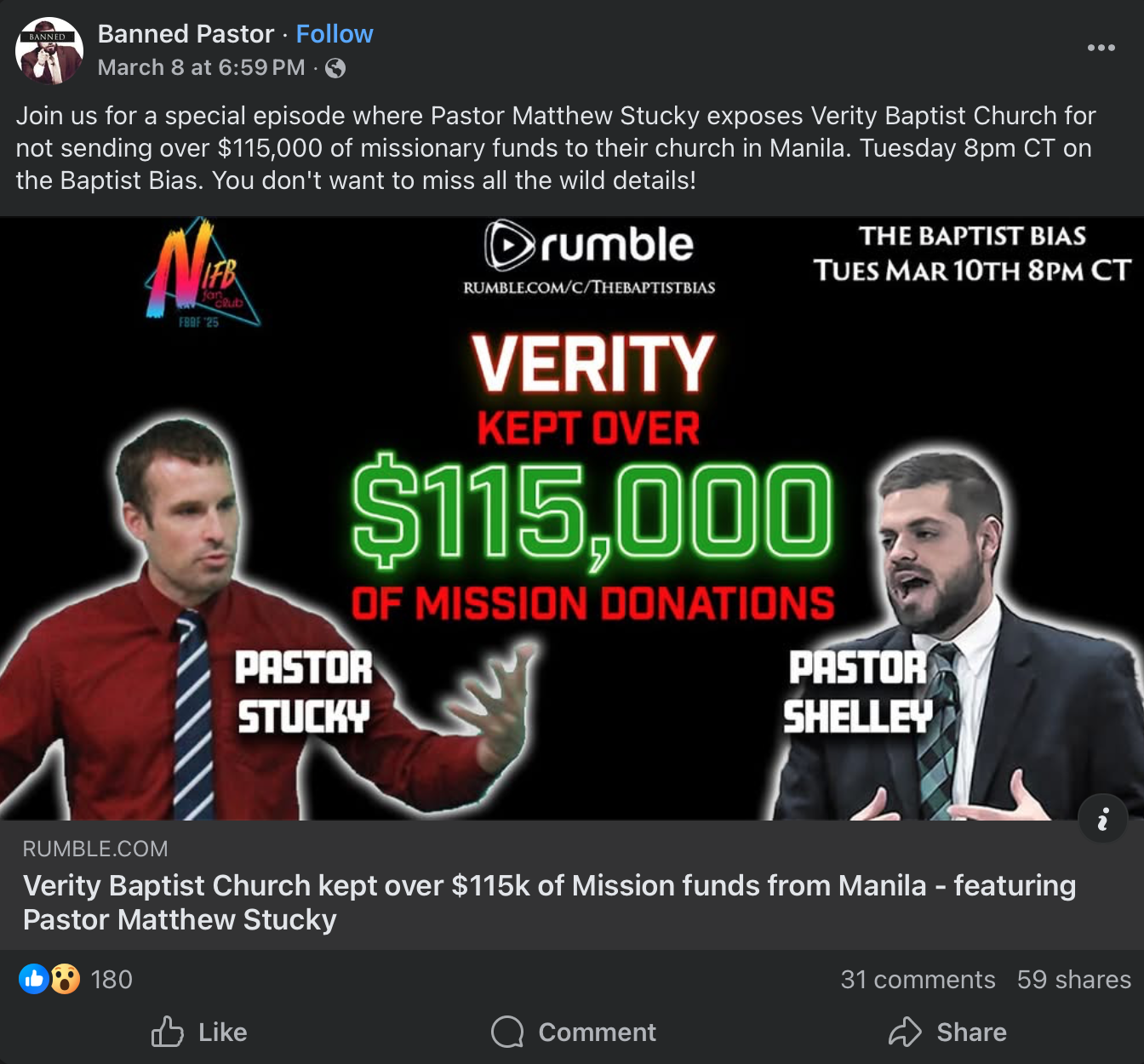 This is similar behavior to what happened with Todd Ferguson and The Reason Files before he was murdered and was behavior that was seen across the NIFB-inspired pulpits, including at Verity Baptist Church under Roger Jimenez.